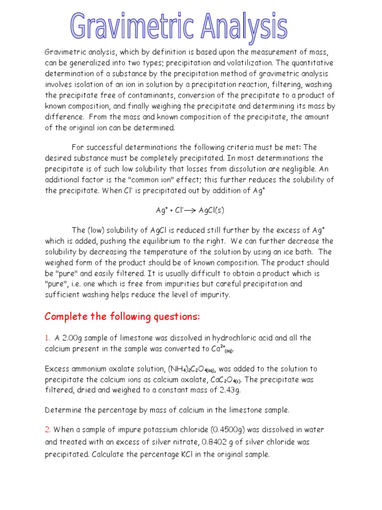 Gravimetric Methods Notes Pdf Precipitation Chemistry Solubility from imgv2-1-f.scribdassets.com Check spelling or type a new query. Maybe you would like to learn more about one of these? Gravimetric analysis questions and answers. We did not find results for: